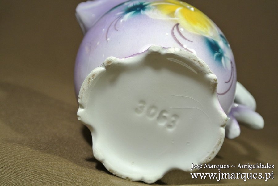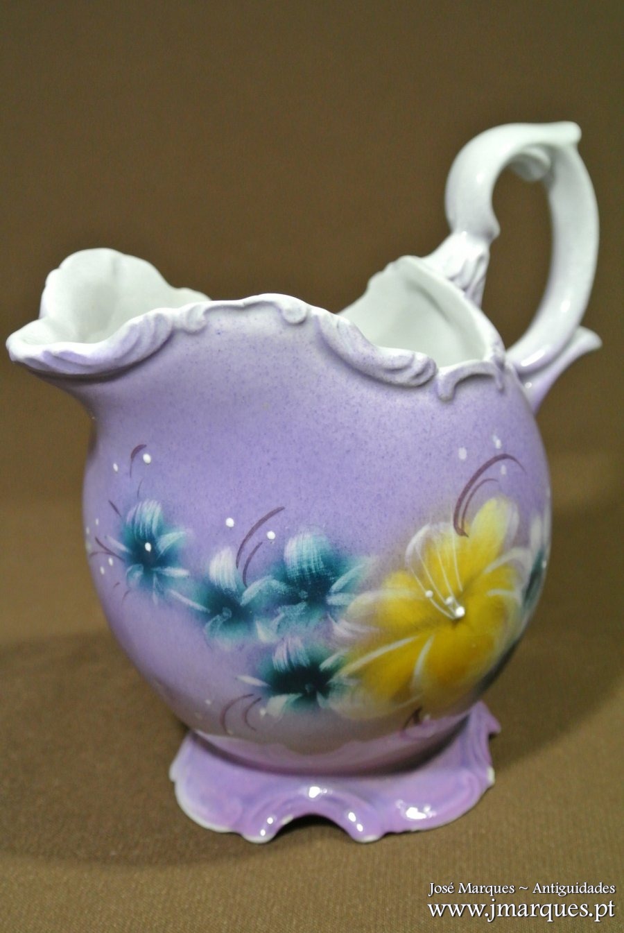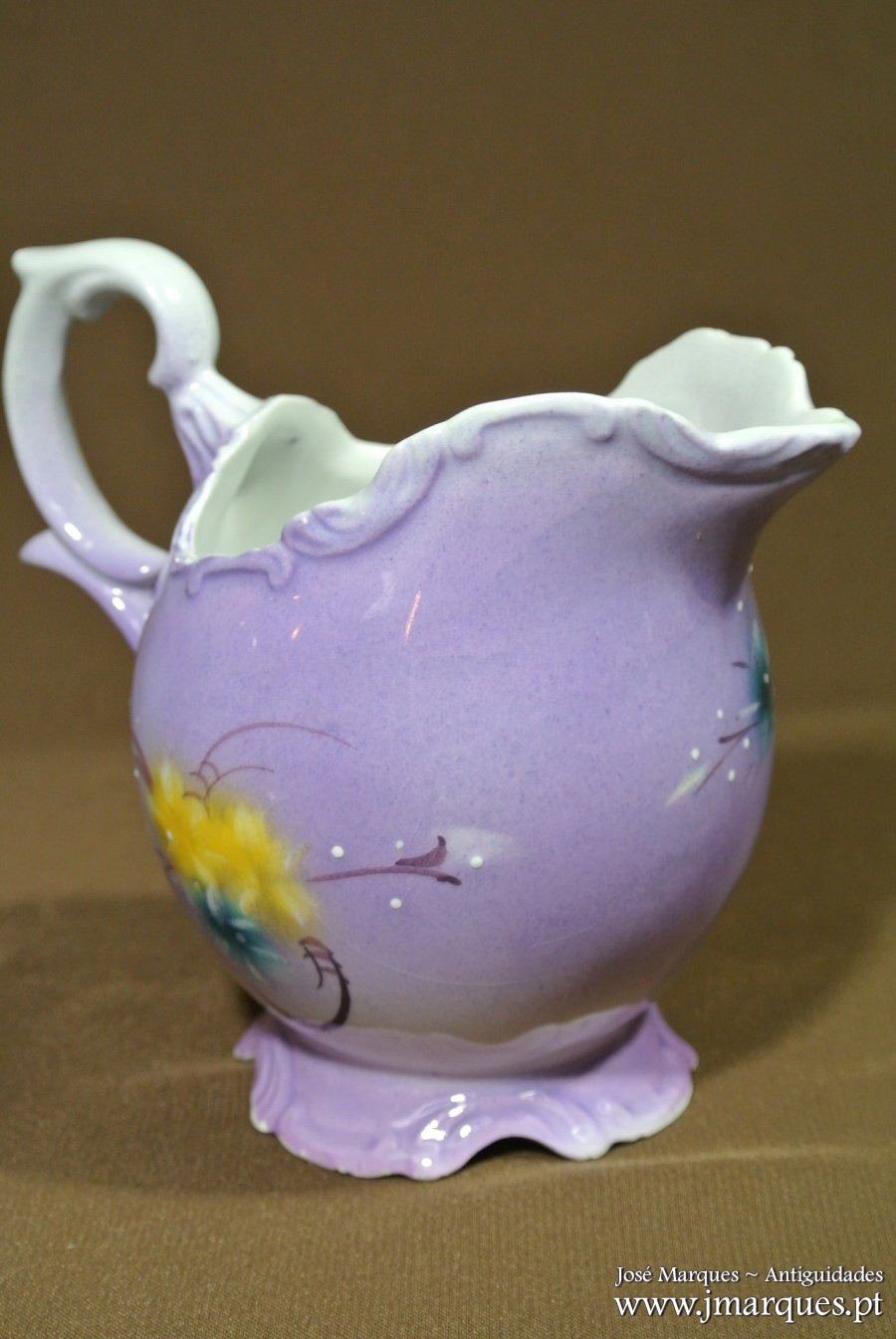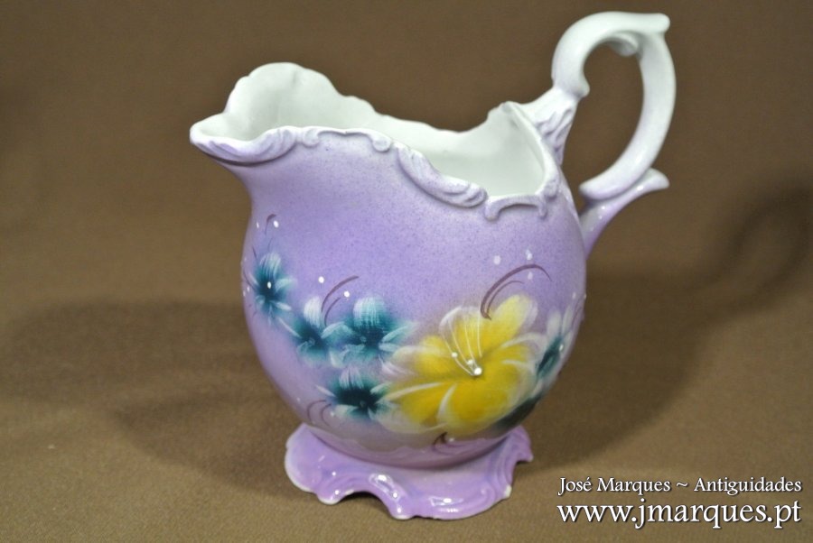 Ref: 364-16€ 15.00Interessante leiteira com pé recortado e trabalhada, antiga em tons de roxo com flores em ambos os lados. Julgamos se uma peça estrangeira. Toque muito ligeiro no pé.
