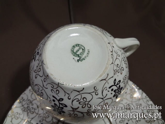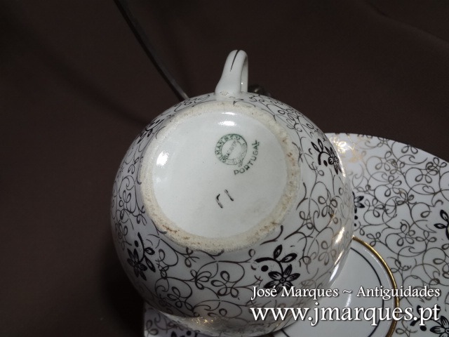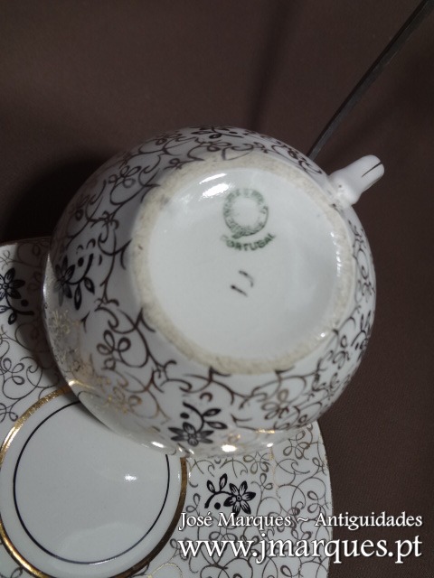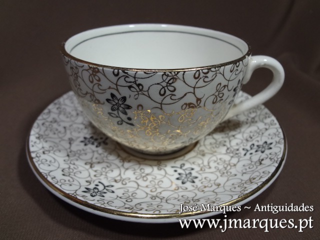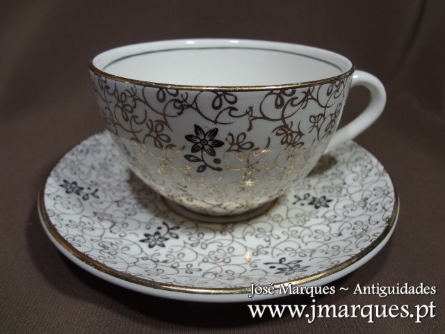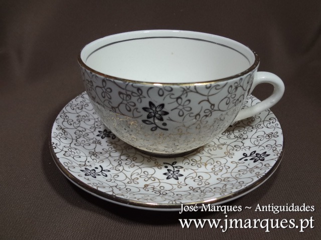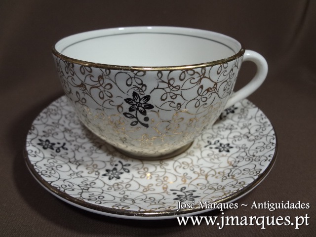 Ref: 366-04€ 12.50Chávena de chá de Sacavém ricamente decorada a dourado e flores pretas. Decoração invulgar. (Suporte não incluído)