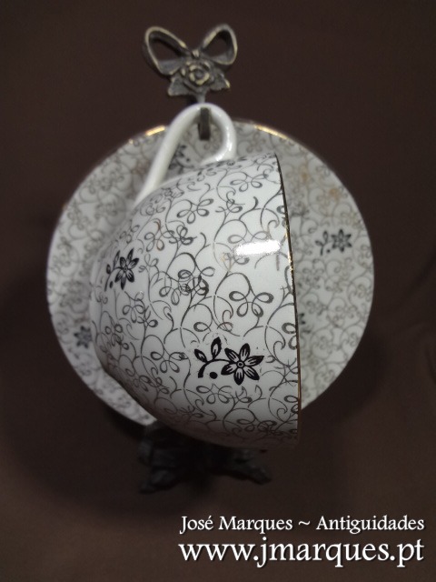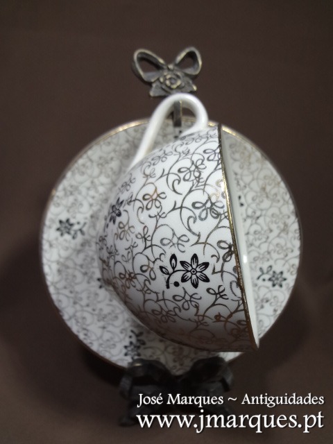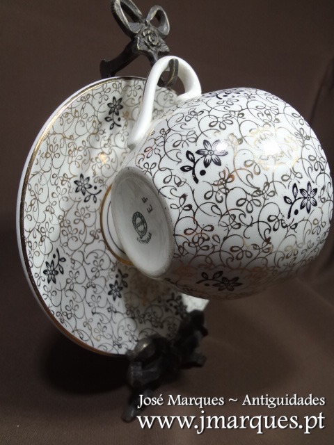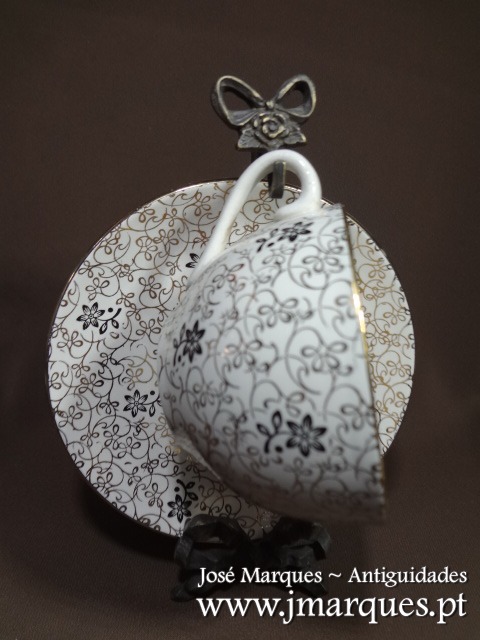 Ref: 366-05€ 12.50Chávena de chá de Sacavém ricamente decorada a dourado e flores pretas. Ligeiros defeitos no pires. Decoração invulgar. (Suporte não incluído)
