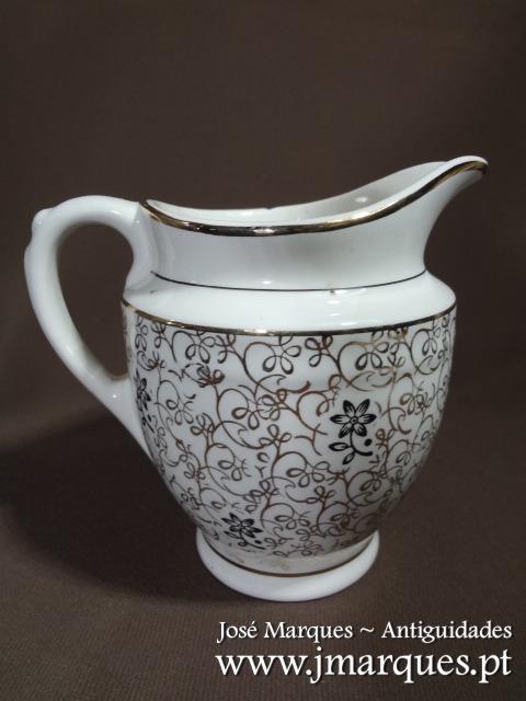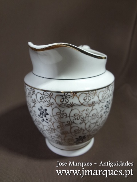 Ref: 366-07€ 10.00Leiteira de Sacavém ricamente decorada a dourado e flores pretas. Toque visível no bordo. Decoração invulgar.